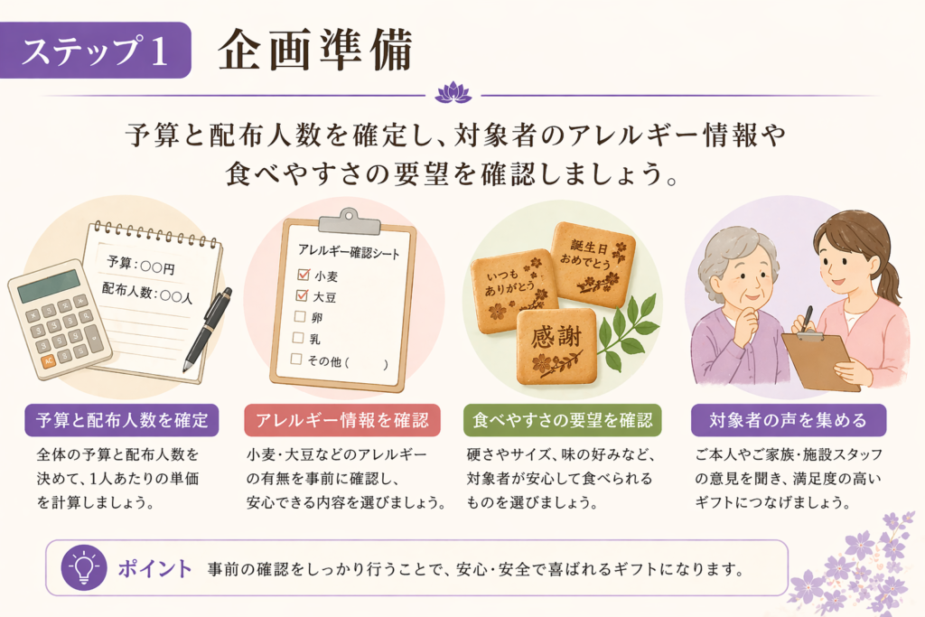 予算と配布人数を確定し、対象者のアレルギー情報や食べやすさの要望を確認しましょう。