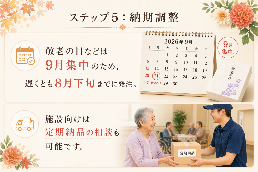 敬老の日などは9月集中のため、遅くとも8月下旬までに発注。